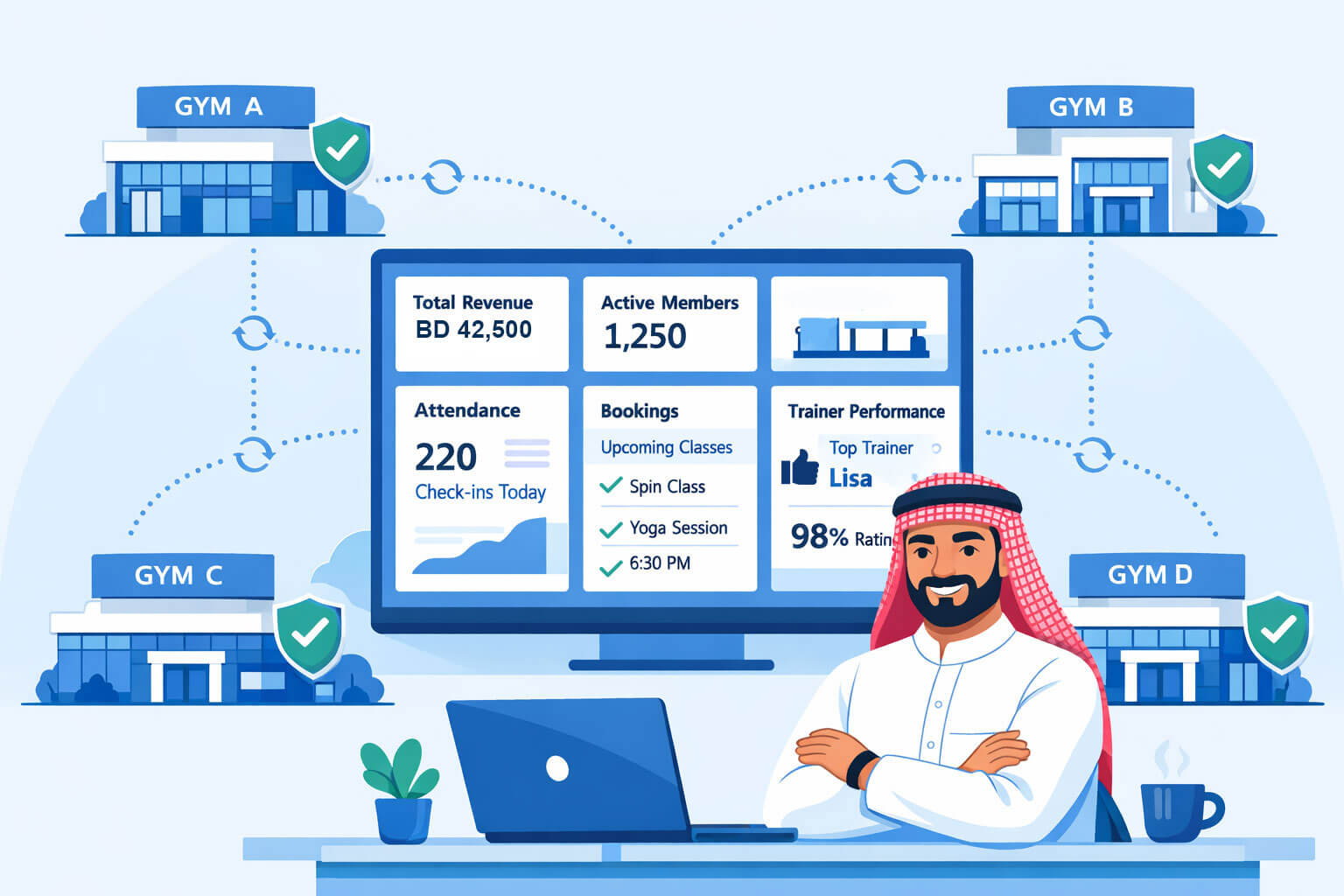 The Centralized Branch Dashboard enables Bahrain gym owners efficiently manage multiple gym locations from a single secure online interface, easily tracking revenue, memberships, attendance, bookings, and trainer performance in real-time with full role-based accountability.